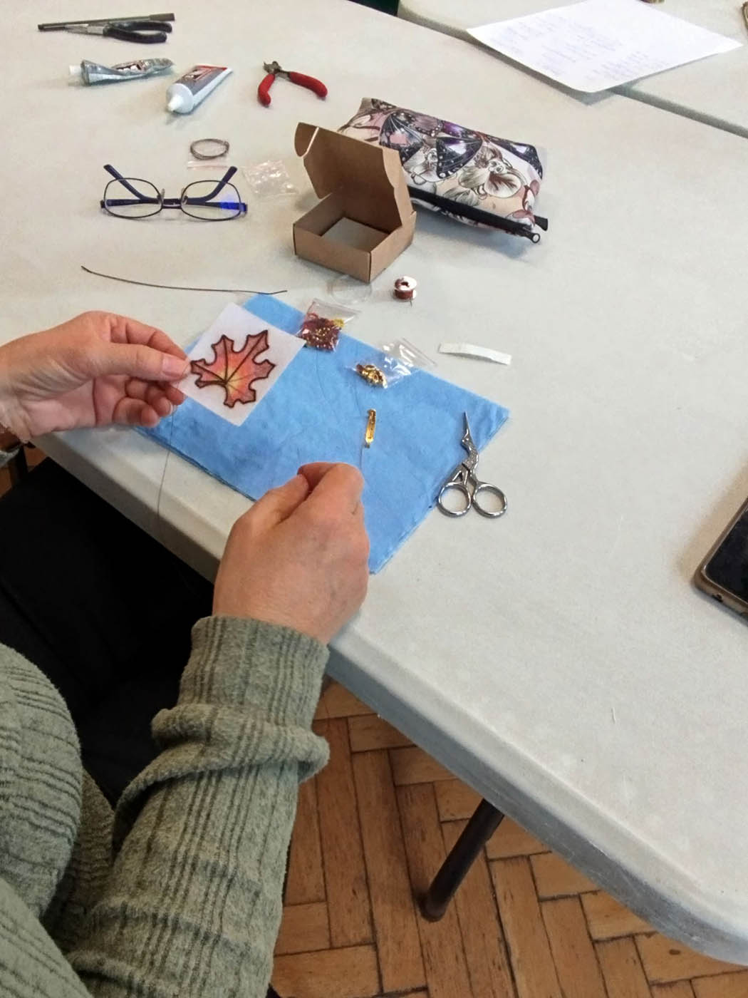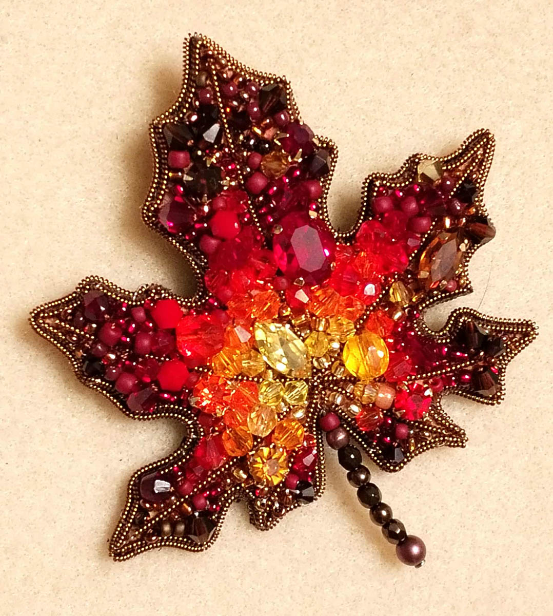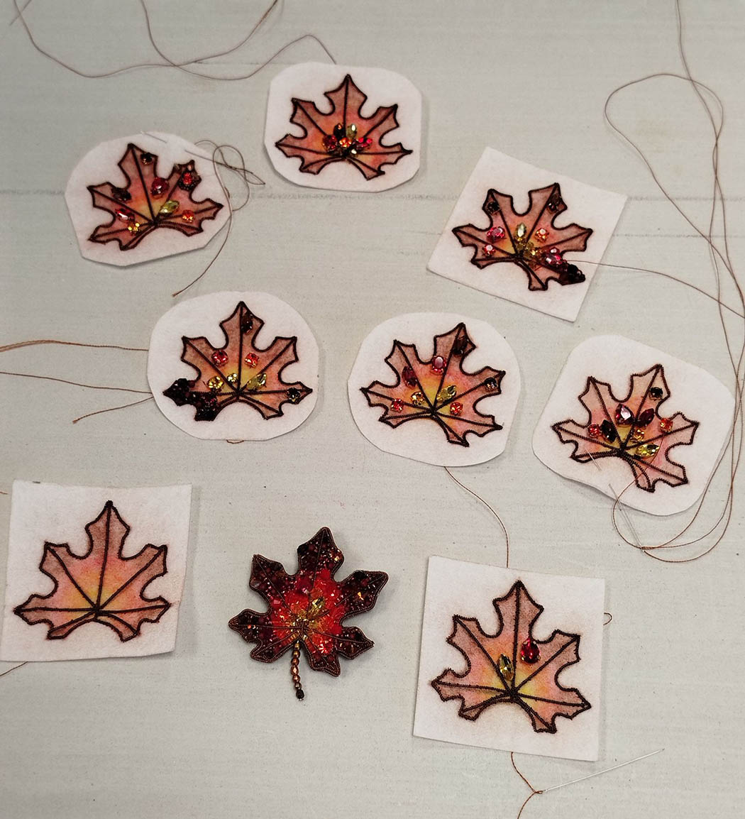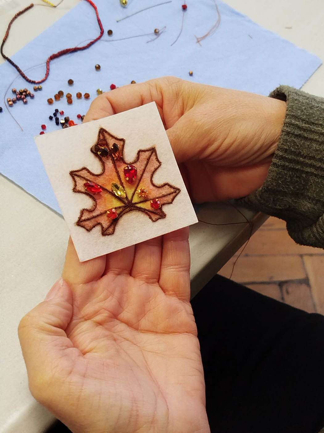 levél alakú kitűző elkészítésére. Elvitt bennünket a gyöngyhímzés csodálatos világába.