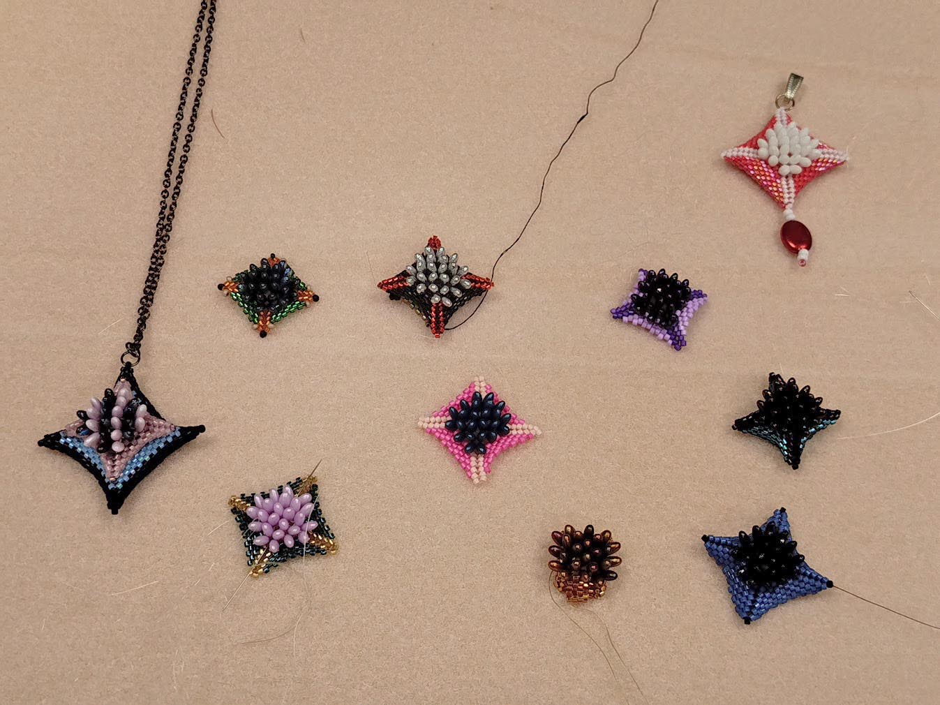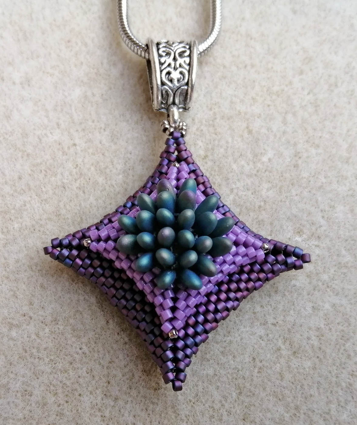 A technika összetett, mert a medálban a RAW, a peyote és a herringbone fűzésmód egyszerre jelenik meg. Különlegessé a rizo gyöngyök felhasználása teszi a delica, kása, bicone gyöngyökön kívül.