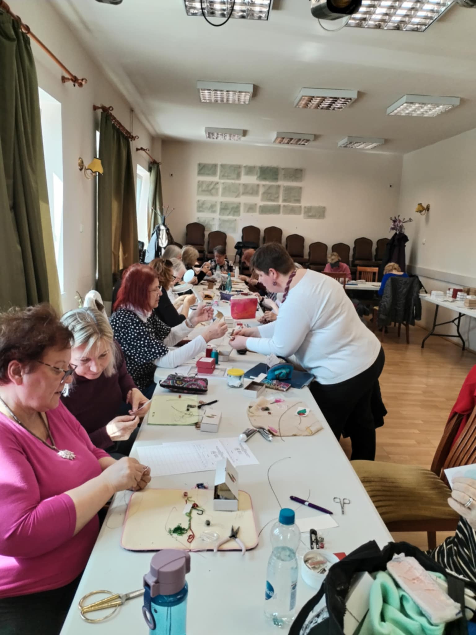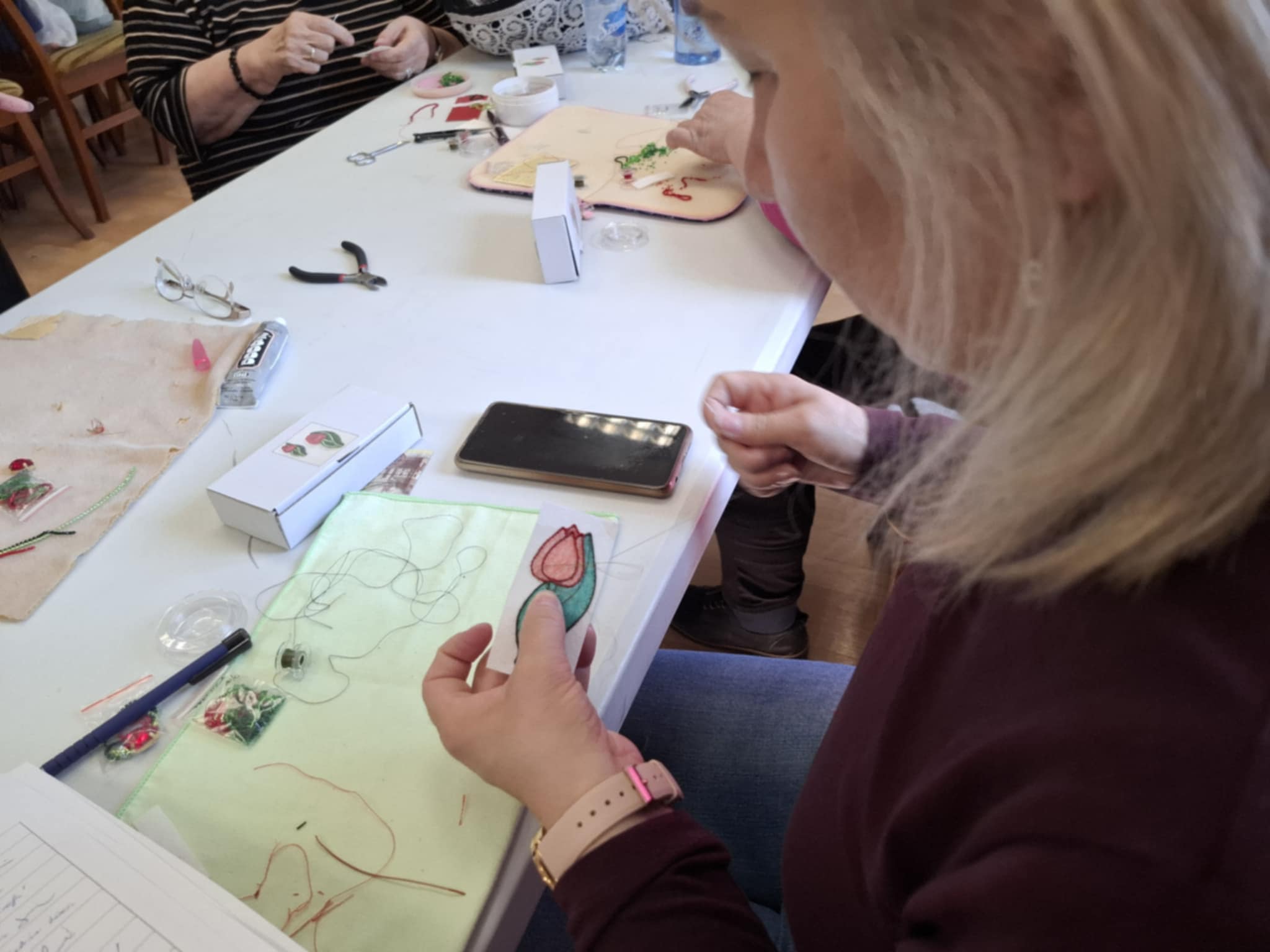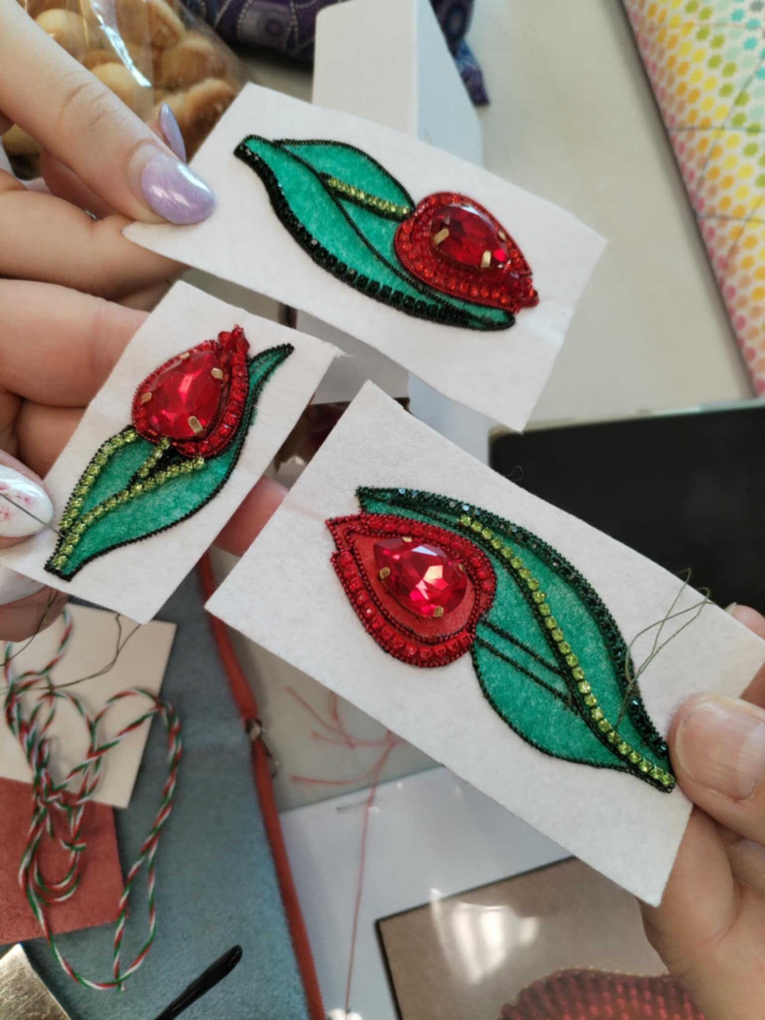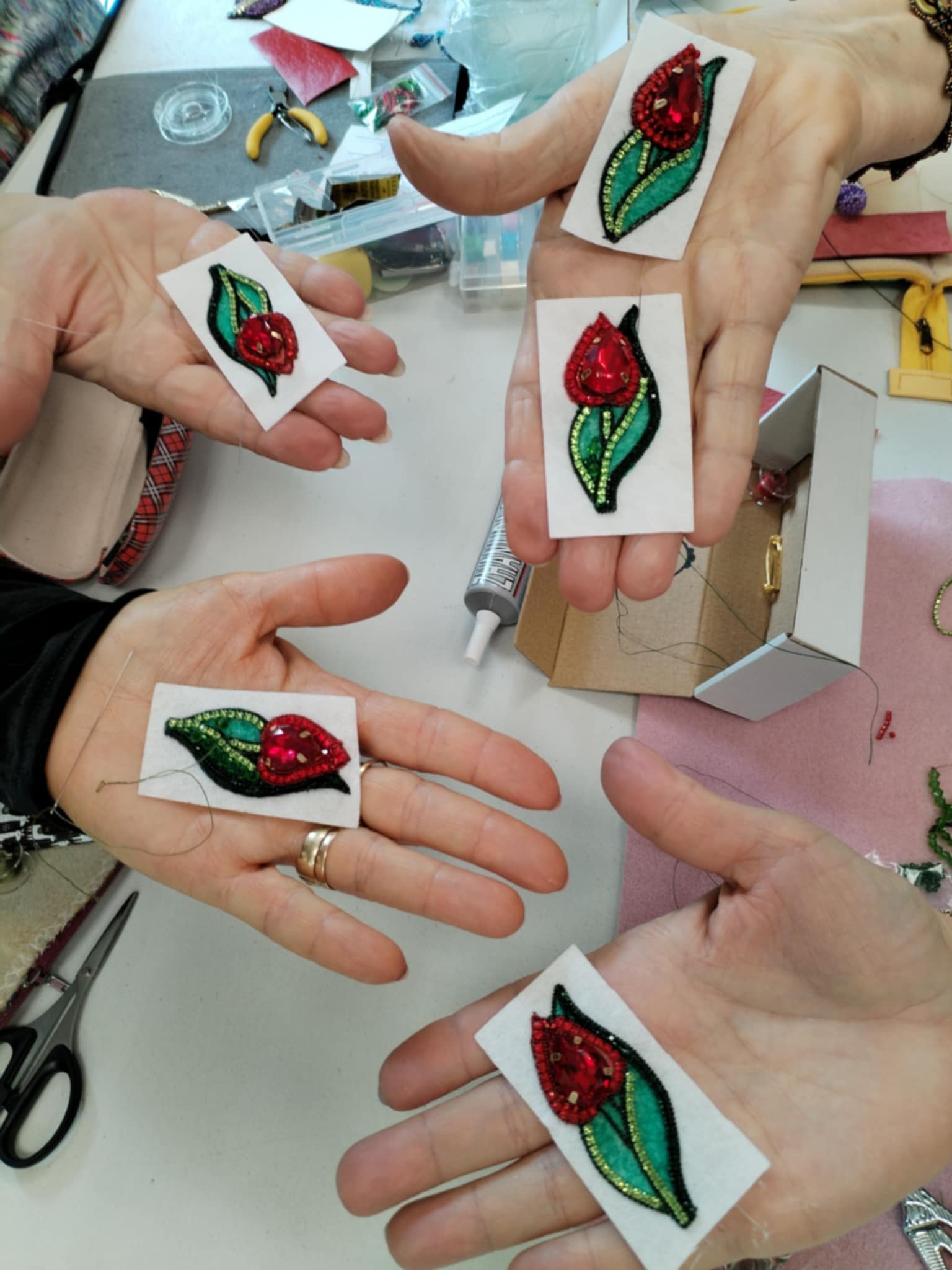 2025. április 5-én tartott foglalkozásunkon Keszler Ágnestől tanultuk meg ennek a gyönyörű gyöngyhímzett tulipános kitűzőnek az elkészítését. Ágnes előre összekészített gyöngycsomagokat hozott magával, és aprólékos magyarázattal segítette a munka menetét.