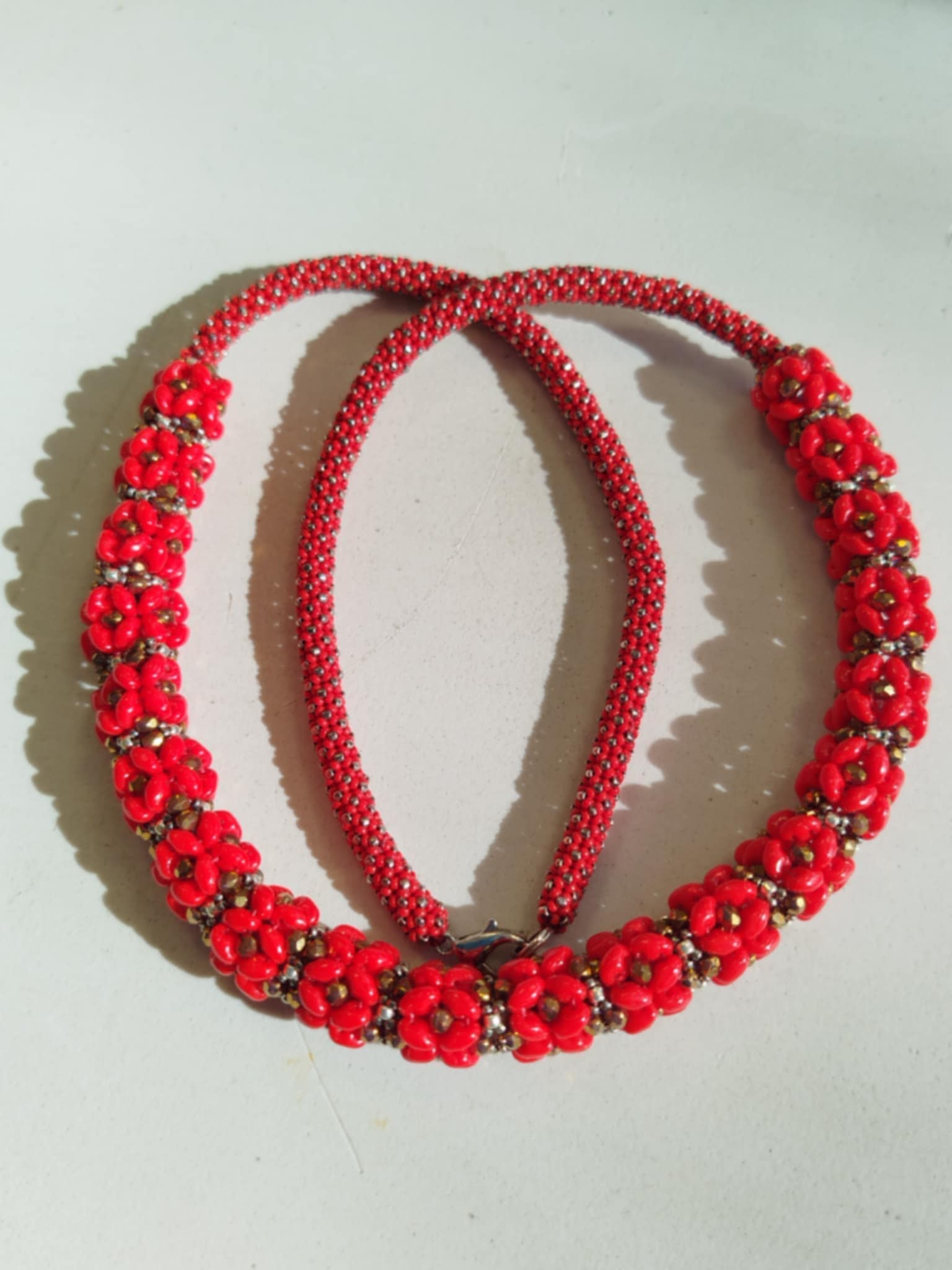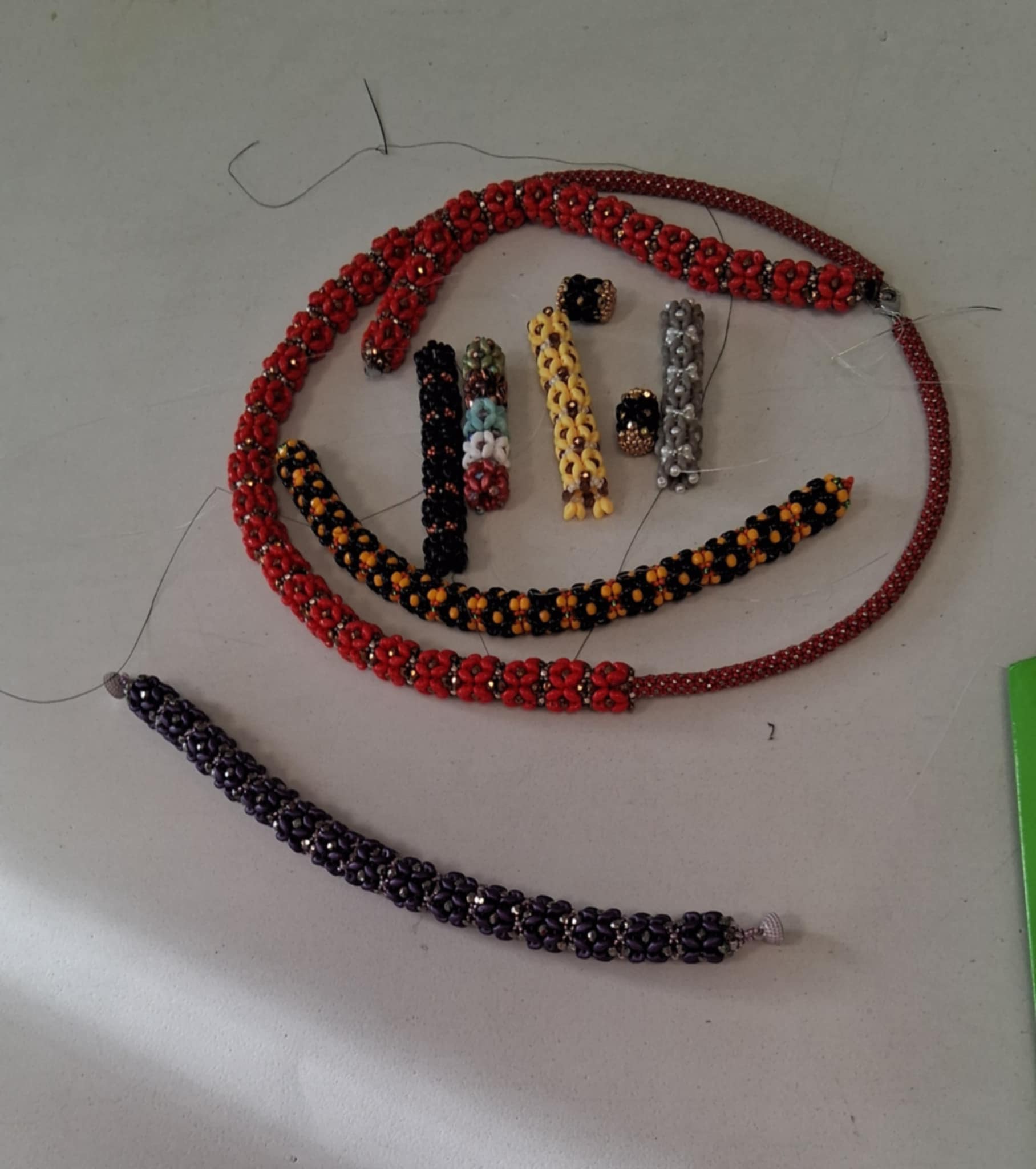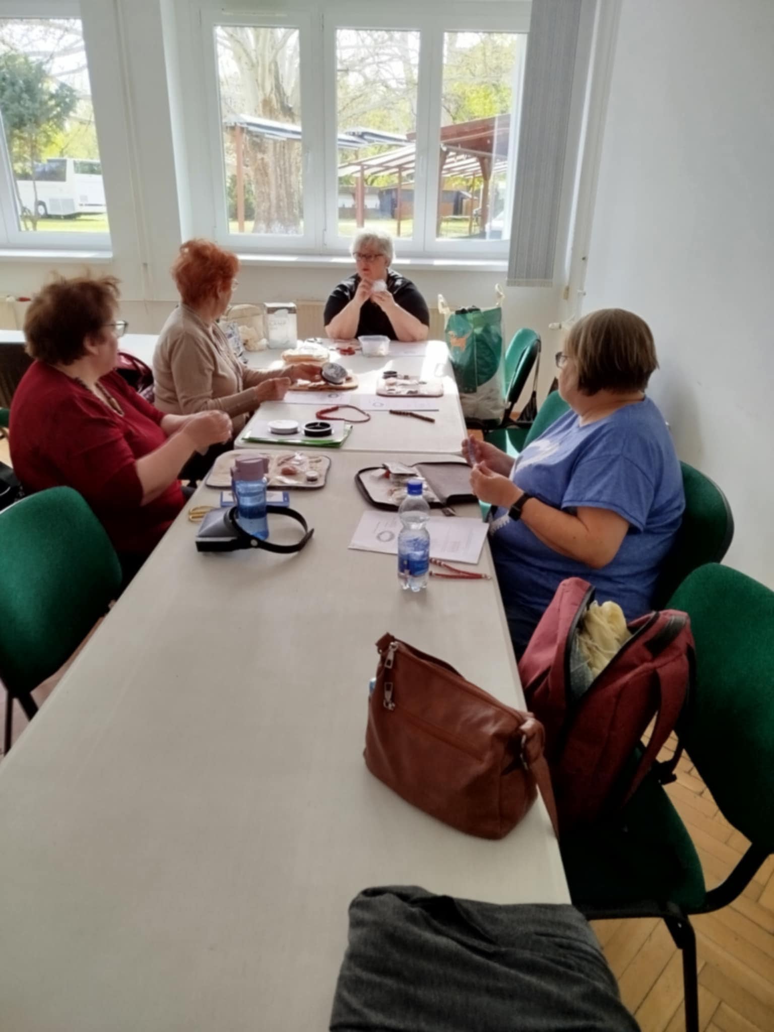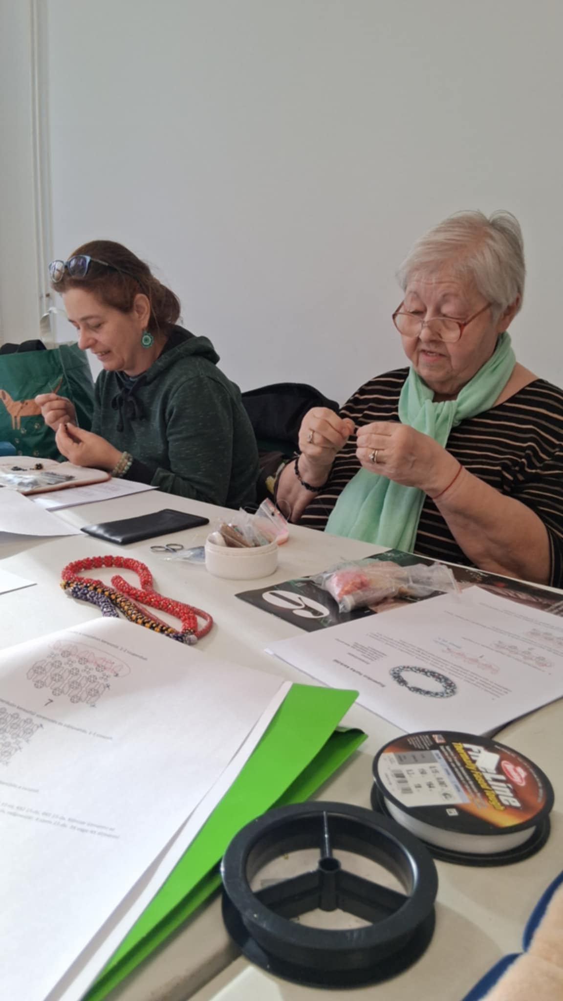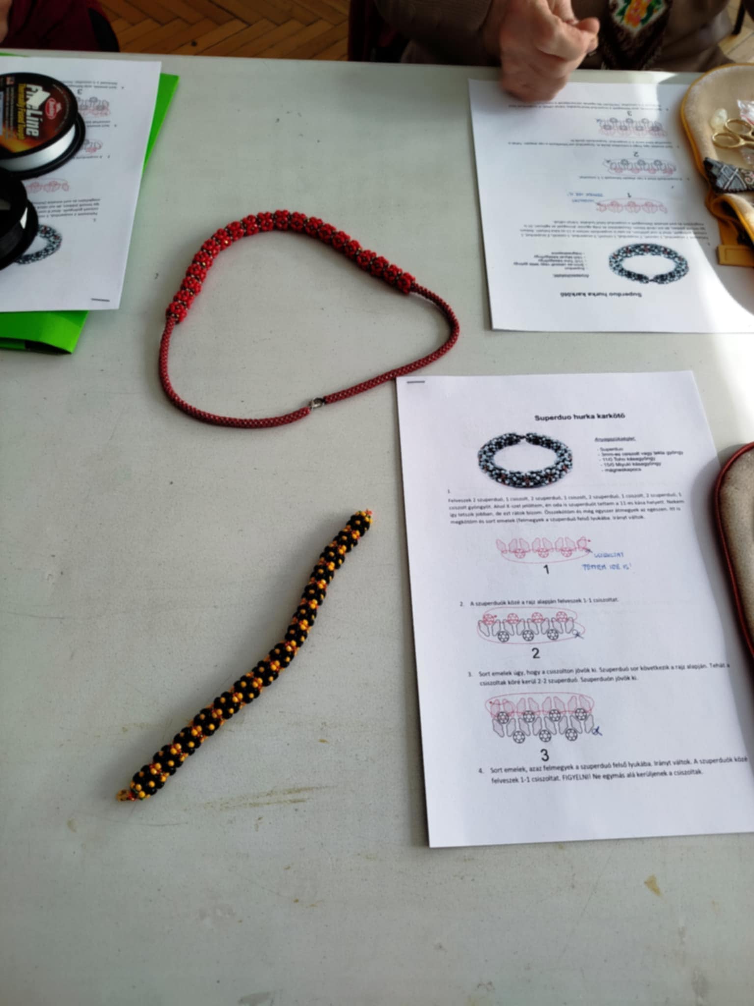 Belényi-Rutai Katica tartott egyesületi foglalkozást 2025. április 11-én. Superduo hurka nyakék és karkötő fűzését tanultuk meg.