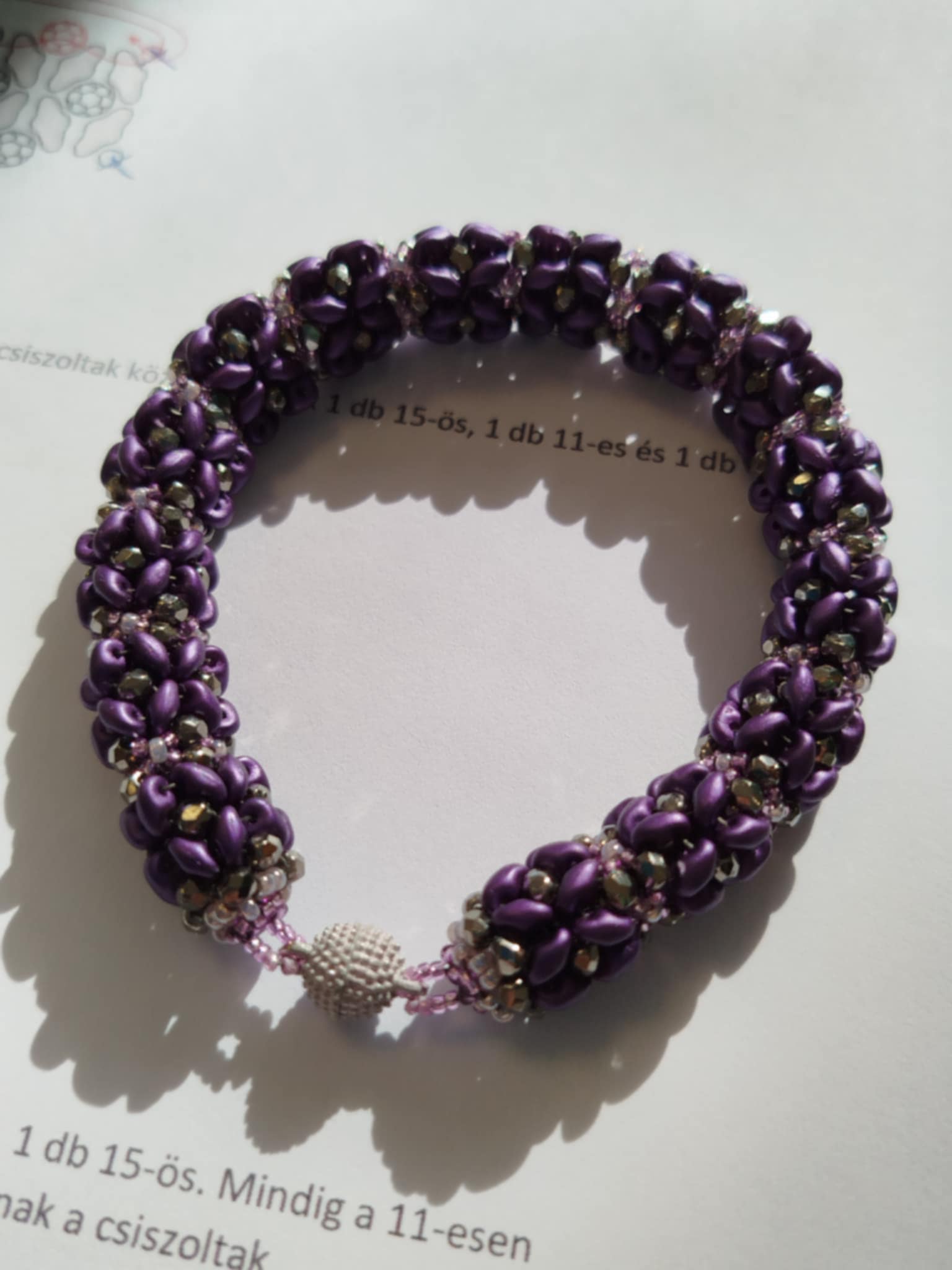 A superduo gyöngyökön kívül csiszolt- vagy teklagyöngyöt, japán Tohót és Miyuki kásagyöngyöket valamint Fireline fűzőszálat használtunk. Mágneskapoccsal zártuk le az ékszereket.