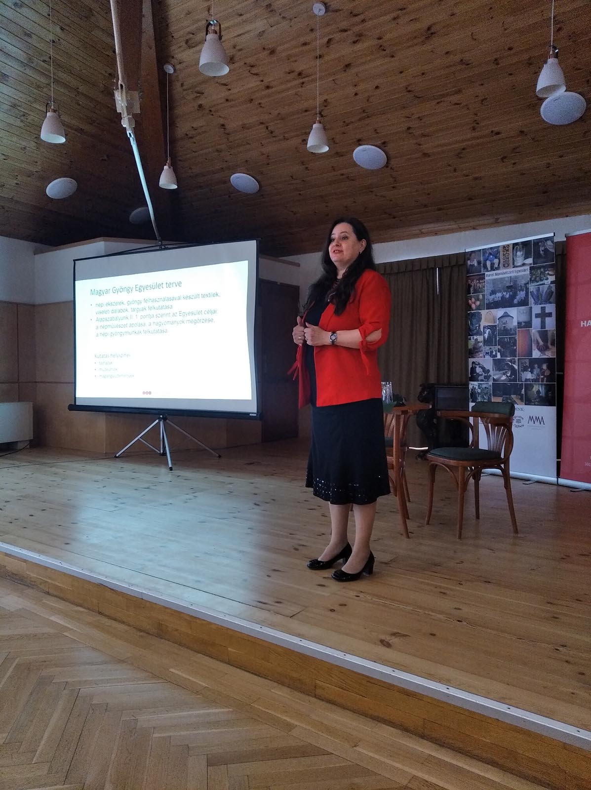 Kutatási témánkat, mely a tájházakban található gyöngyékszerek, gyönggyel díszített viseleti darabok és egyéb tárgyak felkutatására, rögzítésére vonatkozik, Nagyné Szabó Kinga elnök mutatta be prezentáció segítségével, fotókkal illusztrálva. A konferenciának a törökbálinti Munkácsy Mihály Művelődési Ház adott otthont.