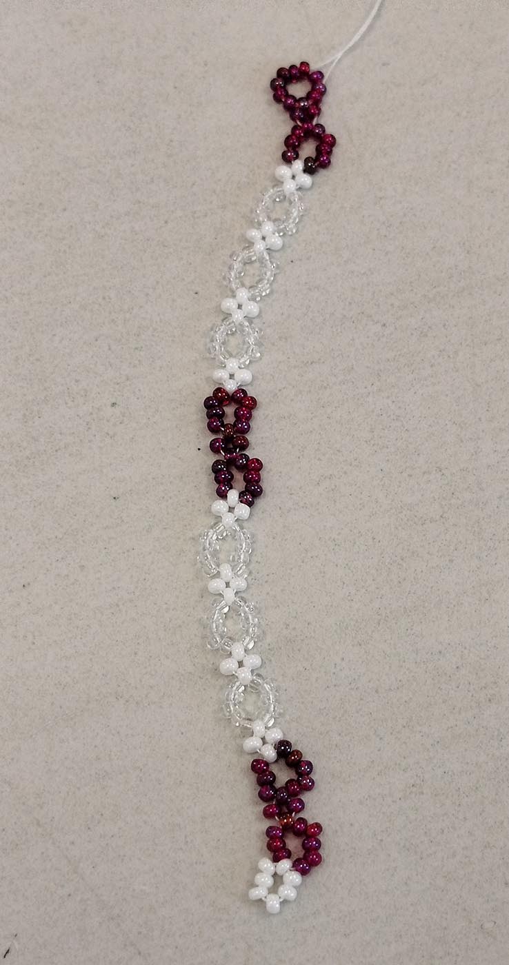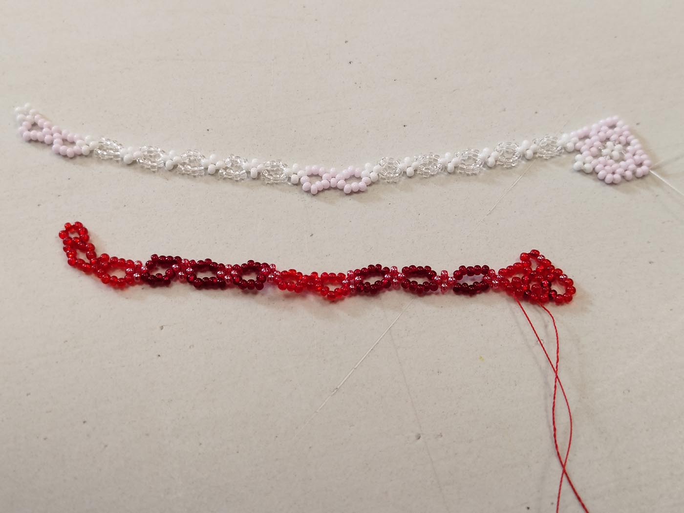 Különböző összeillő színű és méretű kásagyöngyöket használtunk. A kétszálas fűzés nem volt egyszerű, de lassan belerázódtunk.