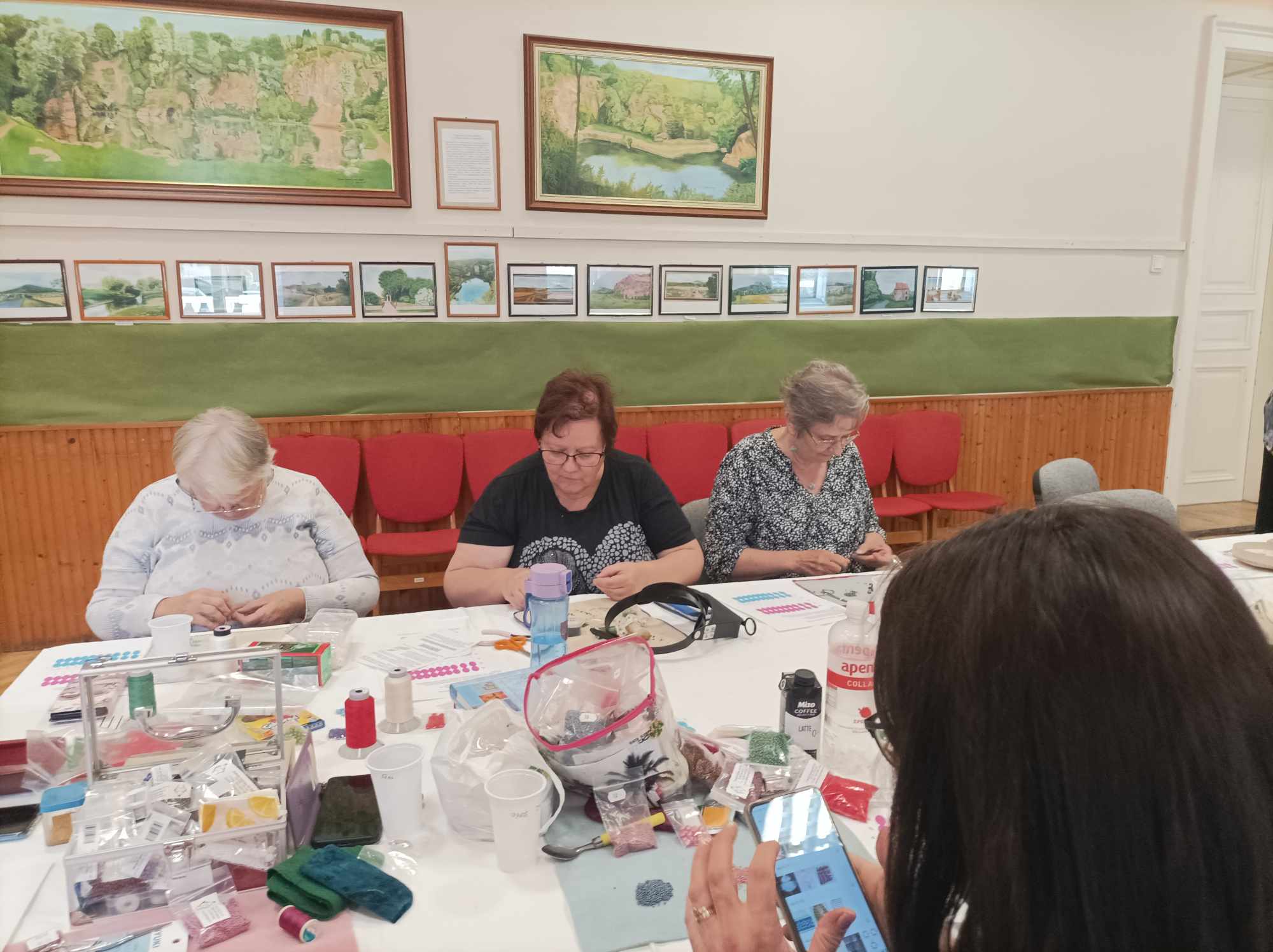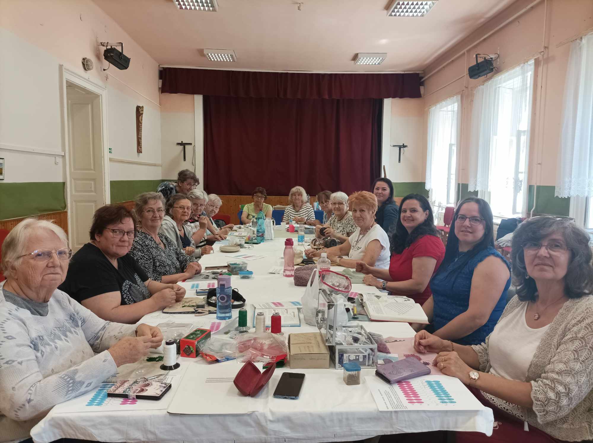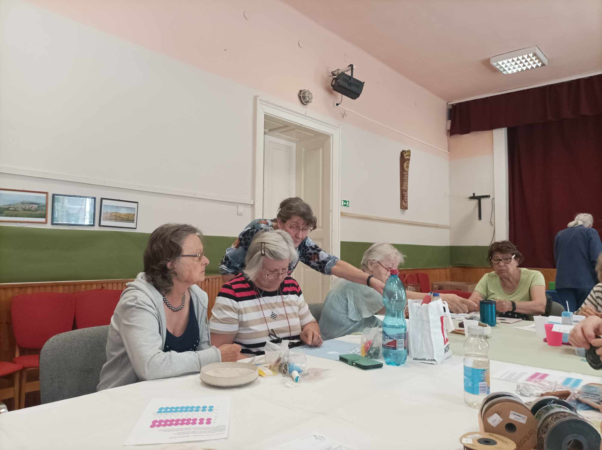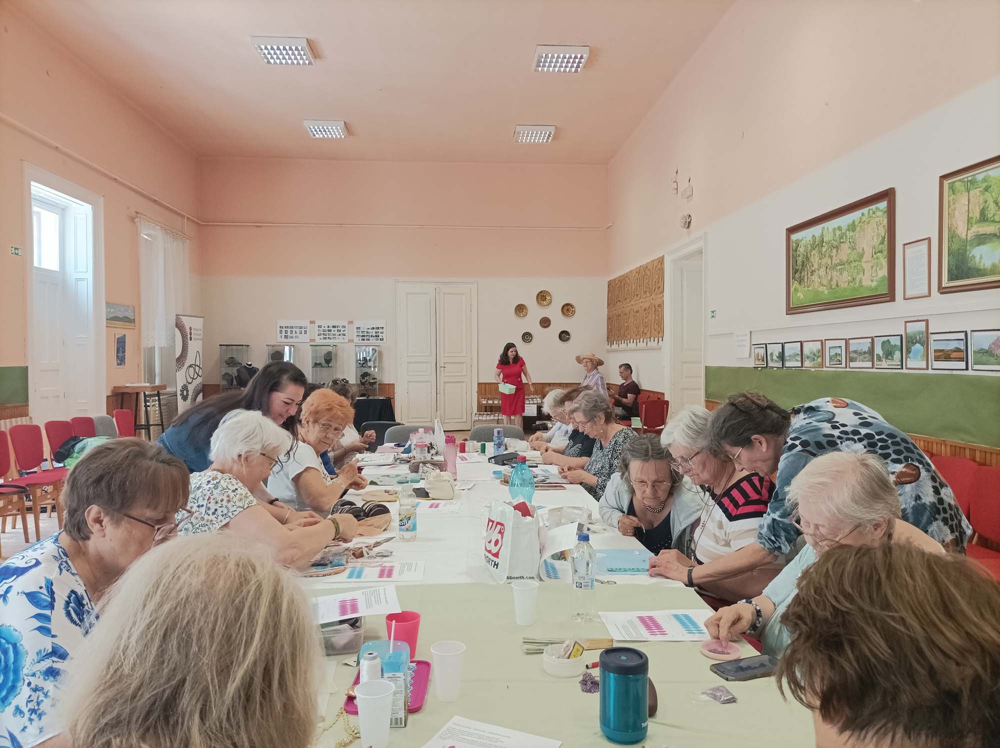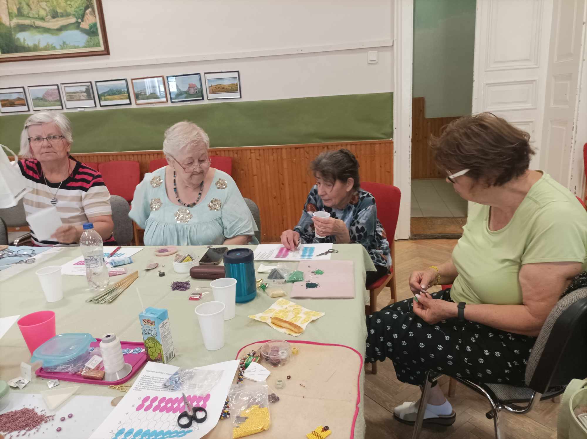 Kedves meghívásnak tettünk eleget 2025. június 14-én. A már hagyományosnak mondható látogatásra Szeghalmyné Ócsai Marianna tagtársunk és férje Péter hívott meg bennünket beszélgetésre és közös gyöngyfűzésre az Apci Közösségi Színtér és Könyvtárba.