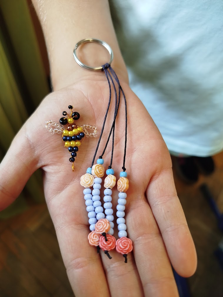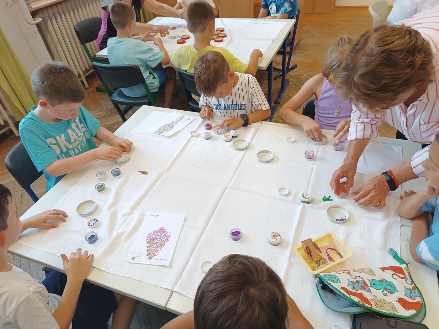 Július 21-én a Budapest IX. kerületi Kosztolányi Dezső Általános Iskolában ismét volt szerencsénk egy napközis tábor keretében gyöngyfűző foglalkozásokat tartani. Simon Szeréna vezetésével Bolega Valéria, D'elia Adrien, Belényi-Rutai Katalin és Sturovics Judit egyesületi tagjaink segítségével a résztvevő fiúk-lányok 4 gyöngyös témában készíthettek tárgyakat, ékszereket.