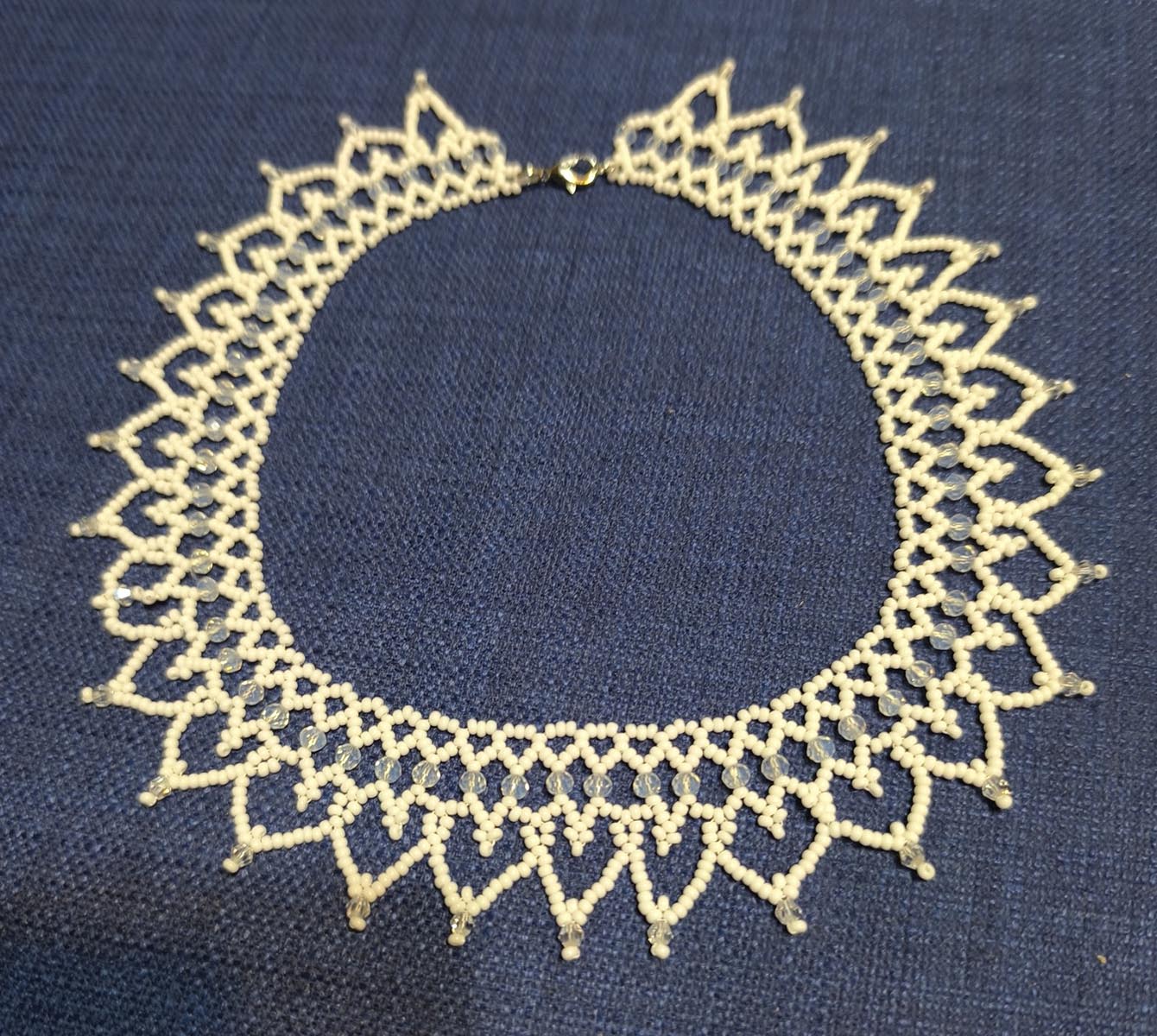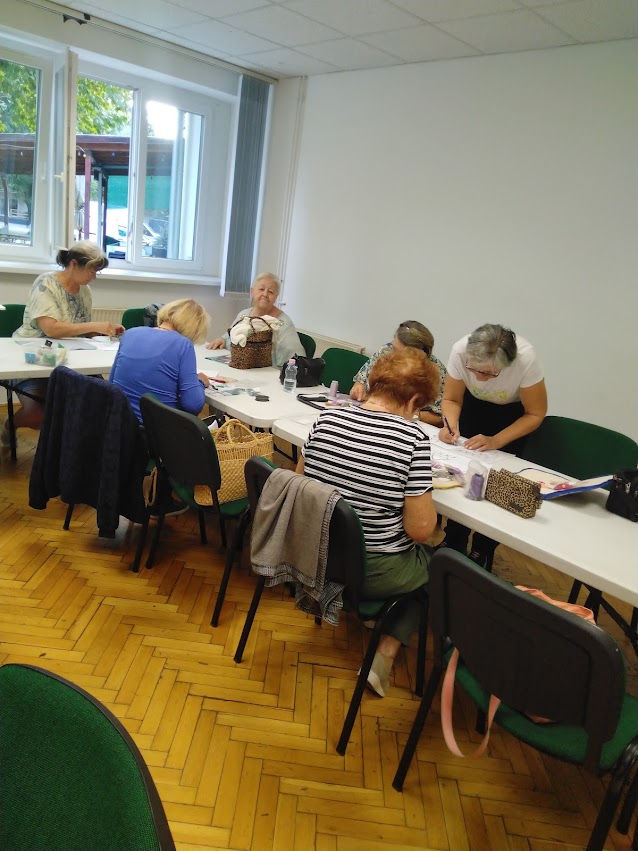 Nokta Istvánné Erzsi tartotta 2025. szeptember 18-i foglalkozásunkat. Egy szíves mintás nyakék fűzését tanultuk meg.