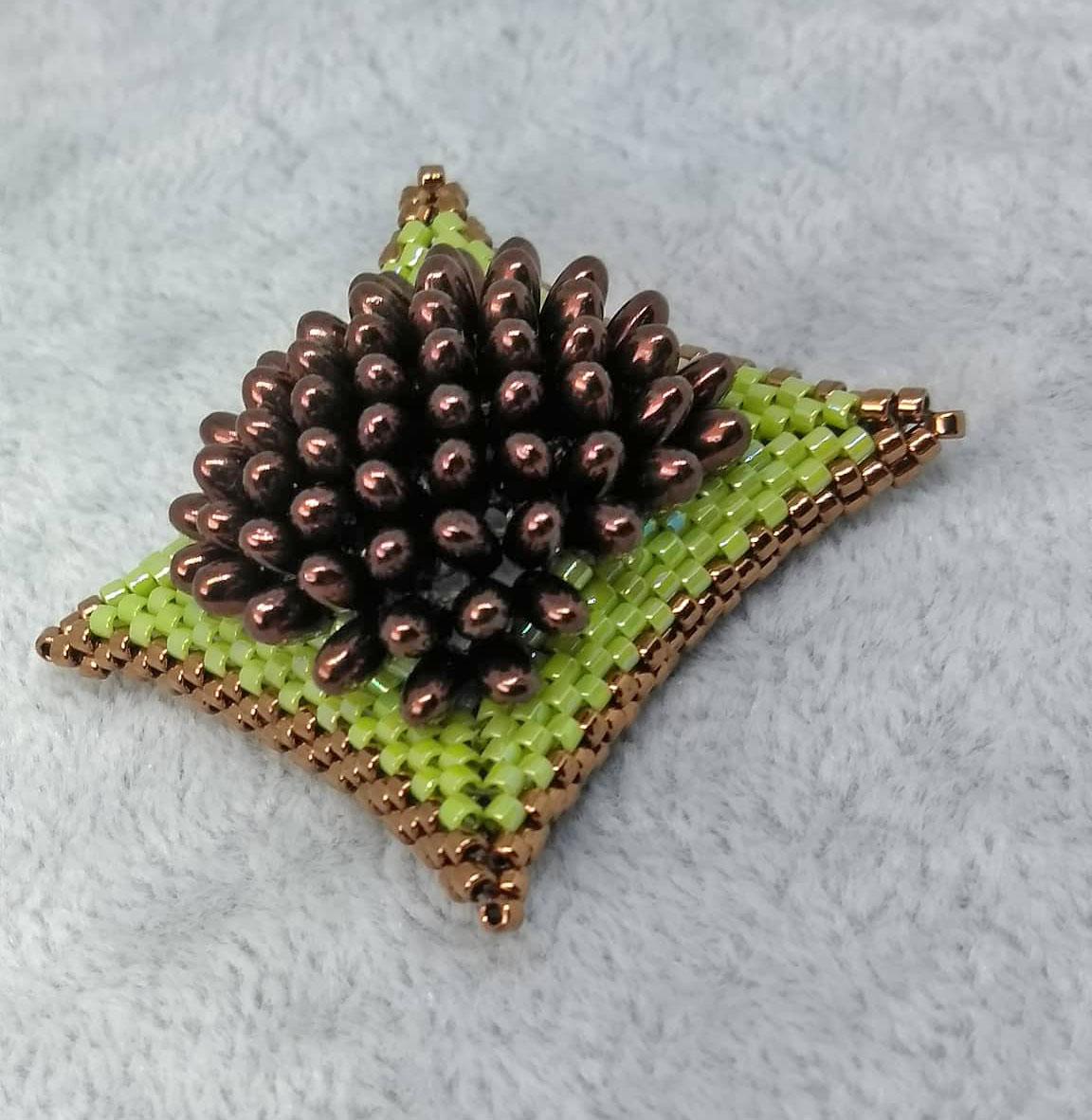 A technika összetett, mert a medálban a RAW, a peyote és a herringbone fűzésmód egyszerre jelenik meg. Különlegessé a rizo gyöngyök felhasználása teszi a delica, kása, bicone gyöngyökön kívül.